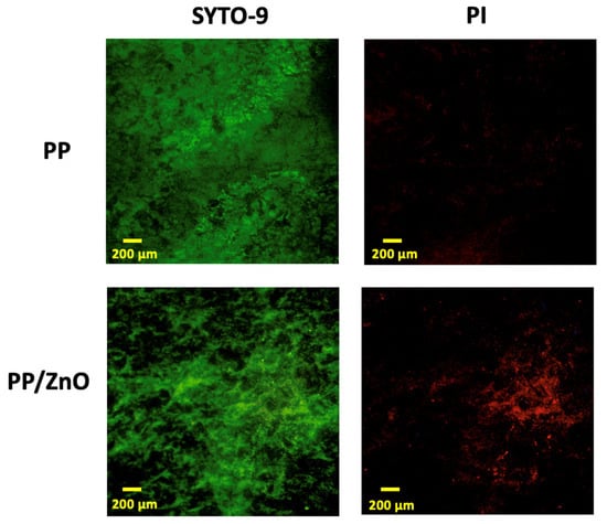Biofilm inhibition assessments. Live/dead BacLight staining of biofilms of Streptococcus mutans cultured on PP and PP/dopamine@30 nm ZnO membranes for 24 h.