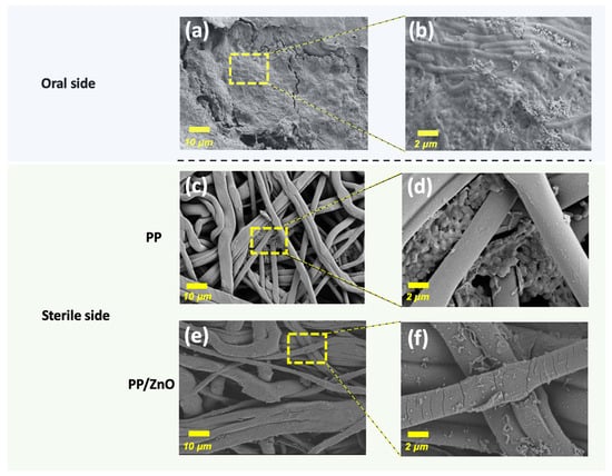 SEM images exhibiting the anti-penetration effect of membranes placed on minipig premolars for 3 days: (a,b) oral side of the membrane; (c,d) sterile side of PP membrane after 3 days bacteria penetration; (e,f) sterile side of Janus membrane (PP/dopamine@30 nm ZnO surface) after 3 days bacteria penetration (Note: the oral side of both the PP and Janus membranes is identical, thus only one group of images is provided).
