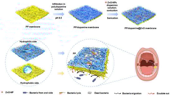 In previous studies using ZnO nanoparticles for guided bone regeneration or guided tissue regeneration applications, ZnO was utilized for its dual antibacterial and osteogenic properties. ZnO has been demonstrated to enhance osteoblast differentiation and exhibit significant antibacterial effects against both planktonic bacteria and established biofilms, thereby helping to prevent infection [,]. Additionally, some studies have highlighted that the porous membranes and ZnO with increased hydrophilicity, can enhance tissue integration, facilitate blood infiltration, and stabilize blood clots, contributing to tissue repair []. However, limited research has focused on the drainage capacity of such membranes. In contrast, our PP/ZnO membrane is engineered for use in oral applications such as pulpitis, where efficient exudate filtration and robust antibacterial protection are critical. Our design features a Janus structure with a hydrophilic side that filters exudates from pulpitis and a hydrophobic side that prevents bacterial adhesion, effectively blocking bacterial penetration. This dual-functionalized membrane integrates both antibacterial properties and exudate filtration in a single material, with the added function of bacterial exclusion, offering it a novel and effective solution for oral applications.