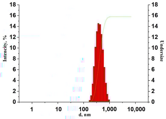 Titanium dioxide Ti-PureTM R-900 (The Chemours Company, Wilmington, DE, USA) with an average size distribution around 400 nm was used for compound preparation. The measurement of the size distribution was performed by dynamic light scattering in a Zetasizer Nano-ZS (Malvern Panalytical, Malvern, UK) analyzer at a scattering angle of 173°. The data were averaged over 10 separate measurements for each sample. The experiments were carried out for dilute suspensions at a concentration of 0.05 wt.%. The TiO2 size distribution diagram is shown in Figure 1.