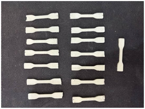 Injection molding for sample preparation was performed using the IM 12 Xplore (Sittard, The Netherlands) injection molding machine according to the following protocol. Powder, pre-dried for 3 h at 120 °C, was loaded into a chamber heated to 320 °C and injected into the mold, heated to 100 °C, at a pressure of 8 bar. After air-cooling to room temperature, the specimens were manually removed from the molds. The shape of the samples conformed to the international standard [] for determining the strength properties of plastics (Figure 2). Fifteen specimens were injected for each series of tests and were mechanically labeled (marks 1 to 15) for further determination of mass loss and density after solid-state post-polymerization.