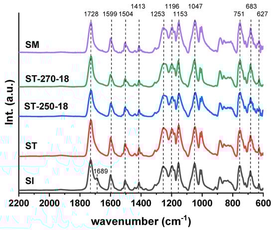 Unlike the amorphous fully aromatic copolyesters and semiaromatic copolyesters, NMR analysis of TMFCCs presents significant challenges due to their limited solubility in solvents [,,]. The samples SI, ST, ST-250-18, and ST-270-18 were analyzed using FTIR spectroscopy (Figure 6). For comparison, a spectrum of a copolyester (designated as SM) with the same composition described in previous work [] was prepared by melt polymerization without SSP. No significant changes were observed in the spectra except for the spectrum of SI. A new band corresponding to the C=O vibration (νC=O) of the ester group appeared at 1689 cm−1 for the acetic end group (CH3CO-). This indicates that SI is more akin to an oligomer than to a polymer. The spectra are very similar to those of the previously described ternary copolyesters based on 4HBA, HBCA, and vanillic acid, with a molar ratio of 3:1:1 [].