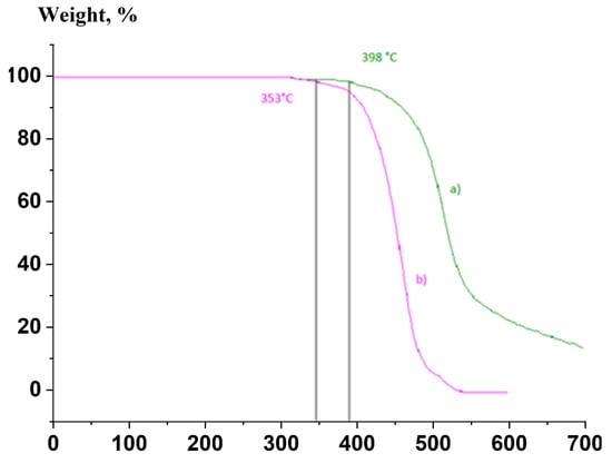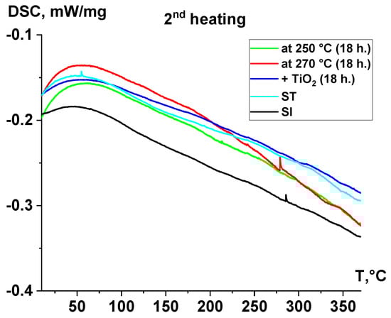 In the DSC curves of the samples (Figure 8), during the second heating cycle, there are no significant thermal effects associated with a vigorous reaction from solid-phase polymerization. However, the reaction continues to occur in all samples, which is reflected in the form of minor thermal effects, primarily observed above 200 °C. For all samples, there are no pronounced thermal effects on the DSC curves that can be attributed to the melting of the studied polymers. Above a temperature of 320 °C, there are no thermal effects indicative of an intensive thermal decomposition process, including in the sample filled with TiO2.