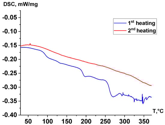 Figure 9 shows the DSC curves for the first (blue) and second (red) heating of the ST sample. Although the infrared Fourier spectra of the sample did not exhibit signals from acetic end groups, the molecular weight remained relatively low, indicating that polycondensation continued during heating. During the first heating, several endothermic effects were observed: the first two, occurring at approximately 95 °C and 195 °C, were likely associated with the melting of low-molecular-weight byproducts that accumulated in the sample during pre-annealing. The most pronounced minimum on the DSC curve, observed above 250 °C, corresponds to the onset of the polycondensation reaction, during which low-molecular-weight polycondensation products dissipate thermal energy. These effects were not observed during the second heating cycle. This can be attributed to the fact that, when a thin sample was loaded into a calorimeter and heated to 380 °C during the first cycle, it significantly increased its molecular weight to high values. In contrast, during the second heating cycle, the rate of polycondensation was considerably slower.