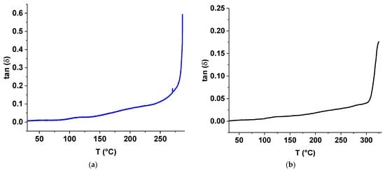 The Young’s modulus of the unfilled sample remained stable up to the flow temperature. In contrast, the modulus of ST-270-18 + TiO2 decreased gradually above 105.9 °C, reducing by a factor of 1.8 before the flow occurred (Figure 11).