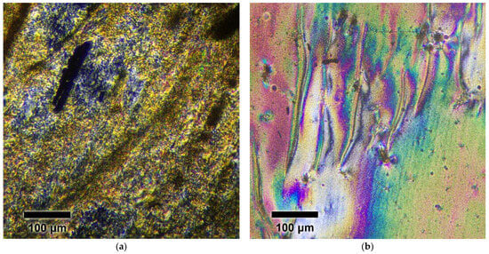A thin film of low-viscosity oligomer SI was prepared by hot pressing between glass slides, while a thin film of prepolymer ST was obtained through solution casting of the ST solution in PFP onto a glass slide. Prior to optical observations, the films were heated to 350 °C and then quenched in air. The films exhibited textures characteristic of the liquid crystal (LC) phase after quenching. Heating both quenched samples to 375 °C and subsequent cooling them did not significantly alter the textures. No isotropization was observed for the SI and ST samples. Most fully aromatic TMCPs do not demonstrate a nematic-to-isotropic transition below 400 °C []. Figure 13 presents polarized optical microscopy images of the oligomer SI and prepolymer ST at 350 °C.