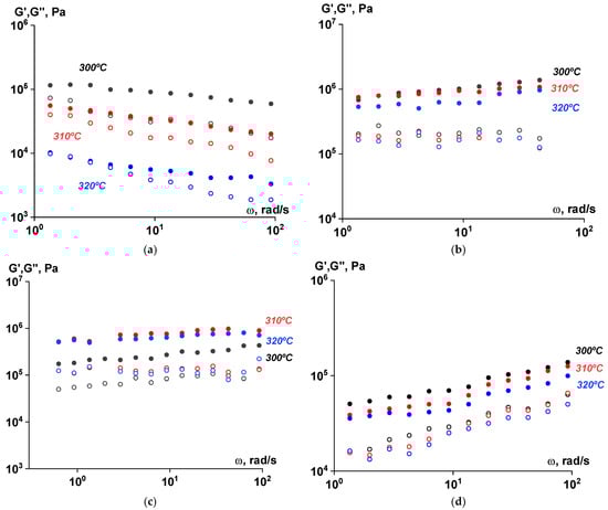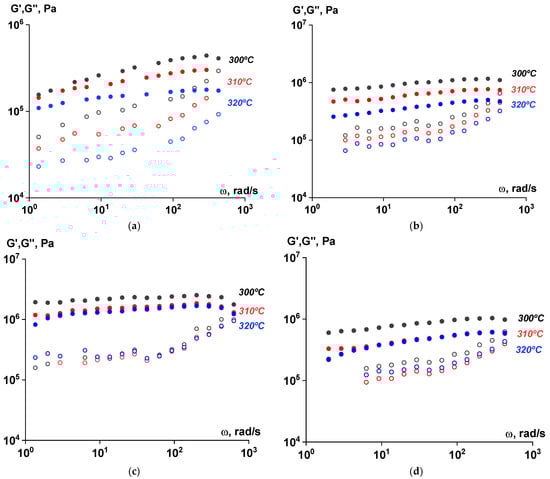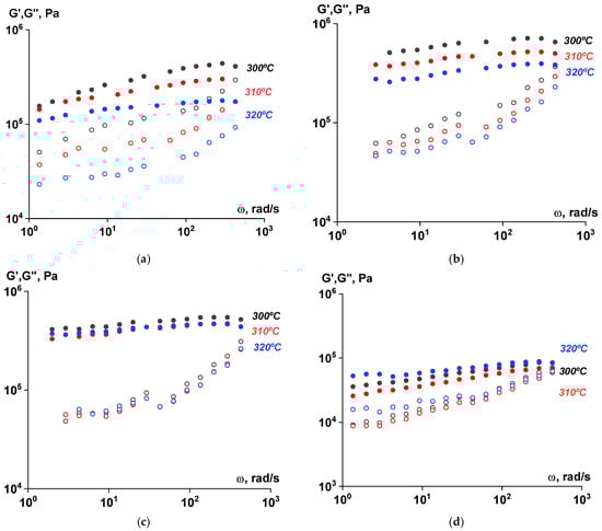Frequency dependences of the components of the complex shear modulus (G′—filled symbols, G″—open symbols) for polymer samples subjected to solid-state polymerization at 270 °C at different temperatures. Amplitude of deformation of γ = 0.001 ((a)—ST polymer; (b)—after 6 h; (c)—after 12 h; (d)—after 18 h).