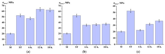 Ultimate tensile strength depending on time of solid-state polymerization ((a)—at 270 °C; (b)—at 250 °C; (c)—filled, at 250 °C).
