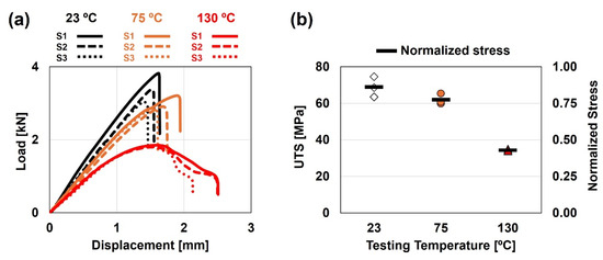 (a) Quasi-static tensile shear tests results at 23 °C, 75 °C, and 130 °C, and (b) joints’ UTS and corresponding normalized average stress.
