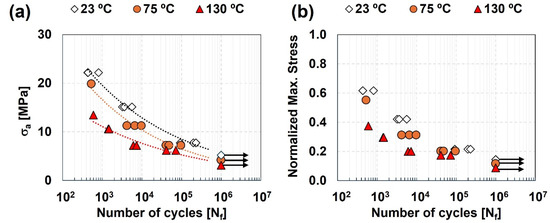 Figure 4a displays attained fatigue curves for the tested temperatures, showing a downwards shift of the curves with increasing test temperature. The highest and lowest fatigue strength values were observed for test at 23 °C and 130 °C, respectively. Fatigue life values between 102 and 105 cycles were obtained for stress amplitudes that ranged between 7.7 and 22.2 MPa at 23 °C, between 7.2 and 19.8 MPa at 75 °C, and between 6.2 and 13.5 MPa at 130 °C. Infinite life () was obtained for stress amplitudes of 5.2, 4.2 and 3.1 MPa at 23, 75, and 130 °C, respectively.