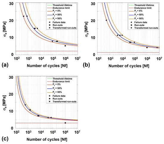 Probabilistic S–N curves for probabilities of failure of 5, 50, and 95% when the specimens are tested at (a) 23 °C, (b) 75 °C, and (c) 130 °C. Threshold lifetime below 102 cycles is not displayed.