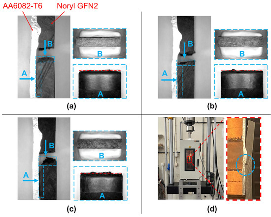 All specimens failed at the polymer side of the joint, close to the interface, highlighting the strength of the binding mechanism within this region, regardless of service temperature. Failure apparently developed by crack nucleation in the transition region between the joining path and the low stiffness region, due to the development of secondary bending moment [25,40]. Development of a secondary bending moment is expected to result not only from the asymmetric joint geometry, with misalignment of neutral lines between both ends of the joint, but also due to the appreciable stiffness asymmetry between base materials. This induces a bending stress component, that stacks to the quasi-static tensile stress component throughout the quasi-static tensile shear test. Consequently, local stress at the failure region can be estimated according to the superposition principle [12,25] (Equation (1)):