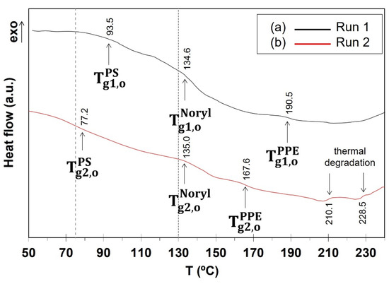 DSC curves of as-received Noryl (10 °C/min): (a) first heating run up to the joining temperature (235 °C), and (b) second heating run through the temperatures of mechanical testing (dashed lines). Tg1,o: temperature of glass transition onset of a given phase on the first heating run; Tg2,o: temperature of glass transition onset of the same phase on reheating.