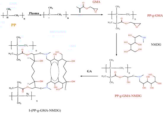 PP melt-blown fibers were obtained from School of Textile Science and Engineering, Jiangnan University. Anhydrous ethanol and anhydrous methanol were obtained from Yasheng Chemical Co., Ltd. (AR, Wuxi, China). Acetone and isopropanol were obtained from China National Pharmaceutical Group Chemical Reagent Co., Ltd. (AR, Shanghai, China). GMA, N,N-dimethylformamide and glutaraldehyde were obtained from Aladdin Biochemical Technology Co., Ltd. (AR, Shanghai, China). 1,4-Dioxane, epichlorohydrin and boric acid were obtained from Lingfeng Chemical Reagent Co., Ltd. (AR, Shanghai, China). N-Methyl-D-glucosamine was obtained from Yuanye Biotechnology Co., Ltd. (AR, Shanghai, China). Hydrochloric acid was obtained from Yonghua Chemical Co., Ltd. (AR, Shanghai, China).