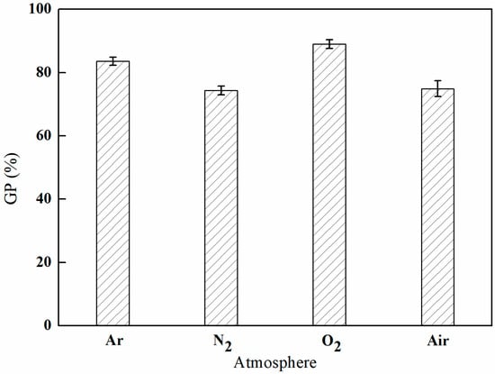 As depicted in Figure 3, the grafting rate of GMA reached a peak of 89.02% in an oxygen (O2) atmosphere, while it was recorded at a low of 74.36% in a nitrogen (N2) atmosphere. This variation can be ascribed to the elevated reactivity of oxygen, which, under plasma excitation, produces highly reactive species, including oxygen radicals, superoxide radicals, and ozone. These reactive species play a crucial role in cleaving chemical bonds on the surfaces of materials, thereby initiating the grafting reactions. Furthermore, the introduction of oxygen-containing functional groups, such as hydroxyl and carboxyl groups, onto the surface of the material enhances both its reactivity and energy, thereby facilitating the grafting process.