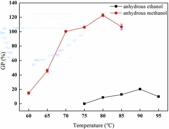As depicted in Figure 5, within the anhydrous methanol solvent environment, the grafting rate exhibits a rapid increase as the temperature increases from 60 °C to 70 °C. The grafting rate continues to rise from 70 °C to 80 °C, albeit at a diminished rate, ultimately reaching a peak of 122.98% at 80 °C. However, further increases in temperature beyond this point result in a decline in the grafting rate. In contrast, when anhydrous ethanol is employed as the solvent, the grafting rate exhibits a gradual increase from 75 °C to 90 °C, achieving a maximum of 20.33% at 90 °C, after which a decline is also observed with continued temperature elevation. Notably, the grafting rate in the presence of anhydrous methanol remains comparatively high throughout the entire temperature range. This phenomenon can be attributed to the higher polarity of methanol relative to ethanol, which enhances the grafting reaction of GMA [21]. Furthermore, the comparatively lower boiling point of methanol relative to ethanol is a critical factor. Although elevated temperatures typically enhance molecular motion and promote chemical reactions, excessively high temperatures may also precipitate an increase in side reactions and solvent evaporation, ultimately impacting the grafting rate [22].