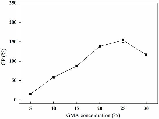 Effect of the GMA concentration on GMA grafting (reaction atmosphere of N2, reaction duration of 2 h, and reaction temperature of 80 °C).