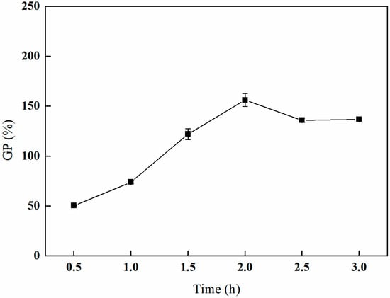 As depicted in Figure 7, the grafting rate initially increases with an extended grafting time, subsequently decreases, and ultimately stabilizes. The peak grafting rate of 156.30% is attained after 2 h of grafting. This behavior can be attributed to the high concentration of reactants present in the early stages of the reaction, which facilitates a rapid reaction rate and a corresponding swift increase in the grafting rate. However, as the reaction time is extended, the concentration of reactants diminishes, leading to a reduction in the reaction rate and the potential occurrence of side reactions. Consequently, the reaction conditions become less favorable for the grafting process, resulting in a decline in the grafting rate [26,27].