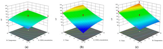 Response surface plots of the interactions between two factors on the grafting effect of GMA. (a) GMA concentration and temperature; (b) GMA concentration and time; and (c) temperature and time.