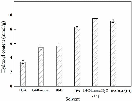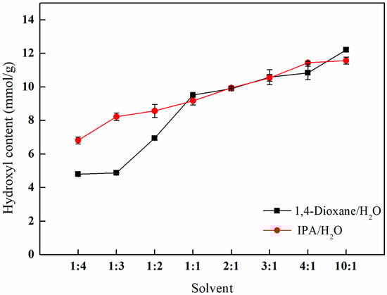 Figure 10 demonstrates the influence of varying ratios of 1,4-dioxane/water and isopropanol/water mixed solvents on the efficiency of amination. The results indicate a progressive increase in the hydroxyl content with the rising volume ratio of the mixed solvent. Notably, when the volume ratio of 1,4-dioxane/water to isopropanol/water reaches 10:1, the hydroxyl content attains its maximum values of 12.21 and 11.57 mmol/g, respectively. At this specific ratio, the amination effect is optimized. Additionally, considering the lower toxicity of isopropanol in comparison to 1,4-dioxane, a mixed solvent consisting of isopropanol and water at a volume ratio of 10:1 is selected as the solvent for the ring-opening reaction.
