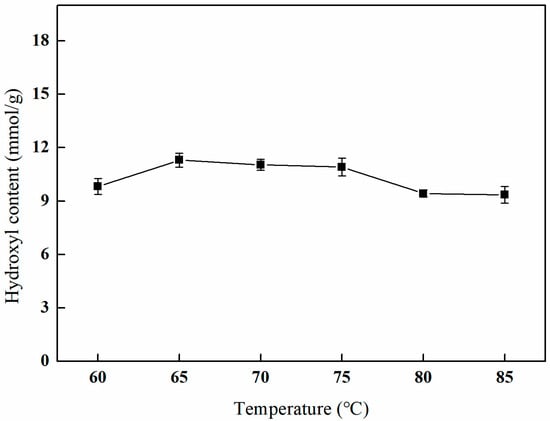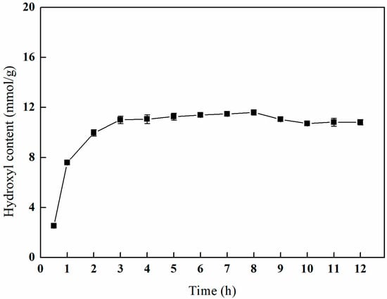 As depicted in Figure 11, the hydroxyl content exhibits a gradual increase during the initial phase, followed by a more gradual change with a prolonged ring-opening time. After a reaction duration of 8 h, the hydroxyl content reaches a peak of 11.59 mmol/g. Following this peak, there is a slight decline in the hydroxyl content, which ultimately stabilizes. The data indicate that at a reaction time of 3 h, the hydroxyl content is measured at 11.01 mmol/g, a value that does not significantly differ from the observed maximum. Consequently, in light of cost efficiency considerations, a ring-opening duration of 3 h is deemed optimal.