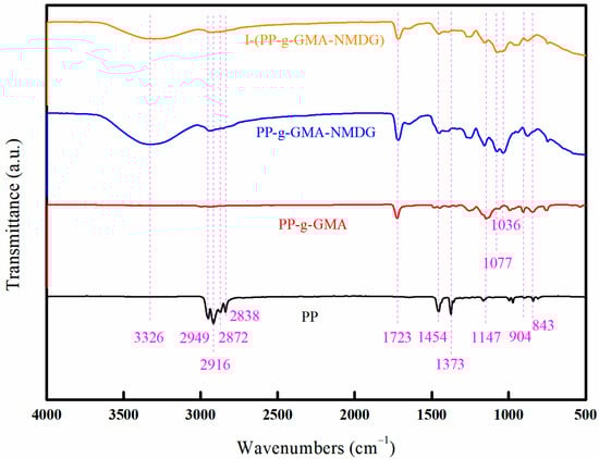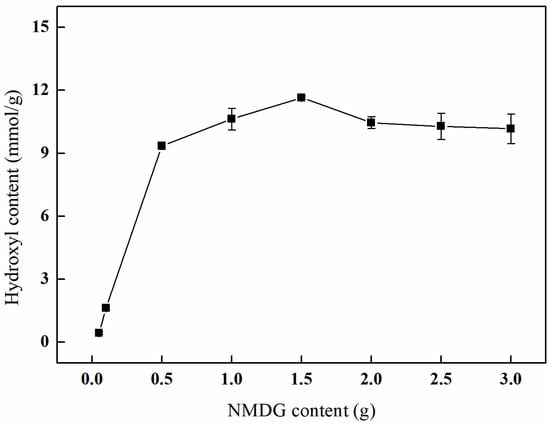 As depicted in Figure 13, an increase in the concentration of NMDG is associated with a gradual enhancement in the hydroxyl content, which ultimately reaches a plateau. Specifically, when the concentration of NMDG attains 1.5 g, the hydroxyl content reaches a maximum of 11.66 mmol/g. This observation can be attributed to the fact that a higher concentration of NMDG leads to a corresponding rise in the number of hydroxyl groups introduced onto the surface of PP-g-GMA fibers. However, as the availability of epoxy groups on the fiber surface becomes limited, the concentration of NMDG approaches a saturation point. An excessive concentration of NMDG may result in a reaction imbalance, potentially leading to incomplete reactions, the aggregation of NMDG, or the generation of by-products. Consequently, this may diminish the number of active sites and negatively impact the effectiveness of the ring-opening amination process.