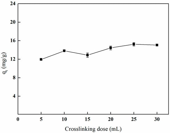 As illustrated in Figure 14, the adsorption effects of the various crosslinking agents on the imprinted fibers exhibited a distinct order: glutaraldehyde > N,N-dimethylformamide > epichlorohydrin. This variation in adsorption efficiency may be attributed to the presence of two aldehyde groups in glutaraldehyde, which facilitate rapid crosslinking with the hydroxyl groups on the surface of the PP-g-GMA-NMDG fibers. Such interactions not only enhance the coordination capacity with boron by introducing new active groups on the fiber surface but also contribute to the formation of a uniform network within the crosslinked material. This network preserves the porous structure of the fibers, thereby promoting boron adsorption. Following the application of glutaraldehyde crosslinking, the final imprinted fibers exhibit a boron adsorption capacity of 11.66 mg/g.