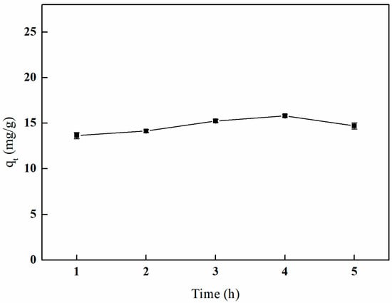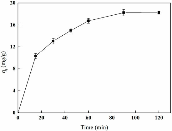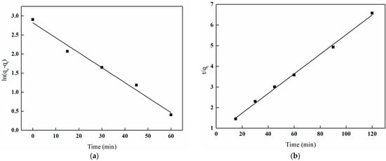where qt represents the adsorption capacity of the I-(PP-g-GMA-NMDG) fibers for boron at time t, mg/g; C0 denotes the initial concentration of boron, mg/L; Ct indicates the residual boron concentration in the solution at time t, mg/L; V is the volume of the adsorption solution, L; and m is the mass of I-(PP-g-GMA-NMDG) fibers, g.