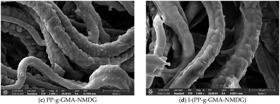 The effect of varying concentrations of GMA on the grafting process was investigated. As depicted in Figure 6, the grafting rate exhibits a progressive increase with elevated GMA concentrations. The grafting rate reaches its maximum of 154.11% at a GMA concentration of 25%. However, with further increases in the GMA concentration, a decline in the grafting rate is observed [23], and partial dissolution of PP fibers is observed when the concentration of GMA reaches 35% or above. This phenomenon can be attributed to the increased availability of GMA molecules that can engage in the grafting reaction, which enhances the overall grafting yield. Nevertheless, as the concentration of GMA rises, the probability of competitive or side reactions occurring during the grafting process may also increase, resulting in a reduction in the grafting rate [24,25].