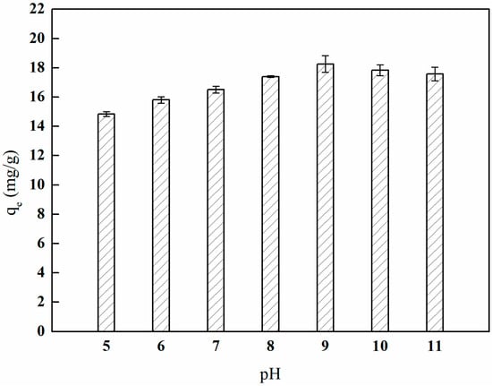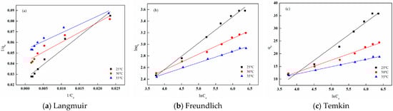The aqueous solution before and after adsorption was filtered through a membrane, and the boron concentration in the water was measured by ICP-OES (iCAP 6300, Thermo Fisher, Waltham, MA, USA). Then, the adsorption capacity was calculated using the following formula.