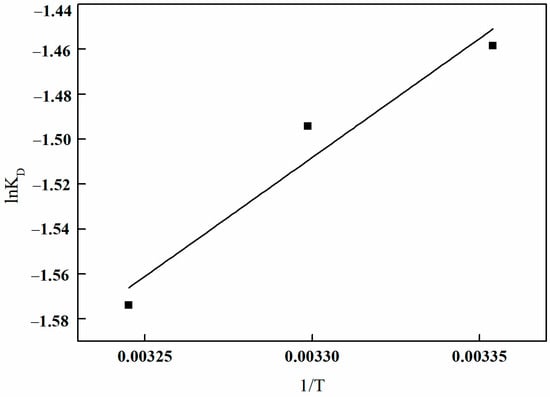 A linear regression analysis was conducted to plot lnK0 against 1/T, as illustrated in Figure 29. The graph demonstrates a strong linear correlation between lnK0 and 1/T. The slope and intercept of the fitted linear equation can be determined. Utilizing Equations (9) and (10), the relevant data for the thermodynamic parameters can be calculated, as presented in Table 7.