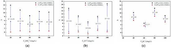 Based on the ionic composition of the salt lake brine, simulated competitive solutions were prepared using boric acid, anhydrous sodium carbonate, potassium bicarbonate, magnesium sulfate, anhydrous calcium chloride, barium chloride, and heptahydrate zinc sulfate. The initial concentration of boric acid was set at 100 mg/L, while the concentrations of the competing ions Na+, K+, Ca2+, Mg2+, SO42−, and Cl− were 20, 40, 60, 80, and 100 mg/L, respectively. This configuration resulted in the formation of six groups of ion competition systems: B(OH)4− + Na+, B(OH)4− + K+, B(OH)4− + Ca2+, B(OH)4− + Mg2+, B(OH)4− + SO42−, and B(OH)4− + Cl−. A 10 mL sample of the simulated competitive solution was taken, and 0.01 g of the I-(PP-g-GMA-NMDG) fiber material was placed in a stoppered glass sample bottle. The bottle was shaken in a constant temperature water bath at 25 °C at a speed of 200 rpm for 2 h, after which the concentration of boron in the aqueous solution was measured. The distribution coefficient kd, selectivity coefficient (k), and relative selectivity coefficient (k′) were calculated using the following formulas [45]:
