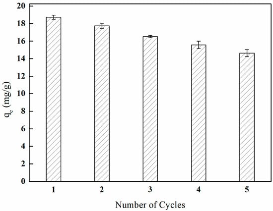 The regenerability of adsorbent materials is crucial for their overall performance. The regeneration performance of I-(PP-g-GMA-NMDG) imprinted fibers was examined through a series of adsorption–desorption cycling experiments. The results are presented in Figure 31. As the number of adsorption–desorption cycles increased, the adsorption efficiency of the I-(PP-g-GMA-NMDG) imprinted fibers gradually declined. After five cycles of adsorption, the material maintained 78.10% of its initial adsorption capacity.