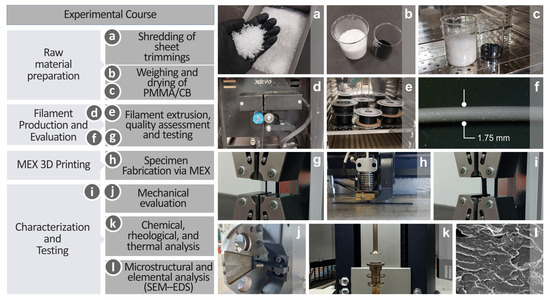 Experimental course presentation including, (a) PMMA sheet trimmings shredding, (b,c) PMMA and CB materials’ weighing and drying, (d–g) extrusion, quality assessment and testing of filaments, (h) coupon 3D printing via MEX, (i,j) mechanical testing, (k) chemical, rheological, thermal, and (l) microstructural and elemental examination.