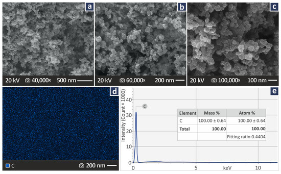 (a–c) CB SEM images at three different magnifications (40,000×, 60,000×, 100,000×), (d) C element dispersion, and (e) elemental chemical analysis of CB.