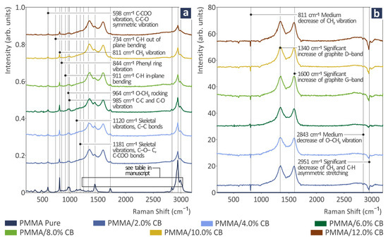 (a) Raman spectra from PMMA/CB 0.0–12.0 wt.%; (b) differences in the Raman spectra of PMMA/CB 2–12.0 wt.% from pure PMMA.
