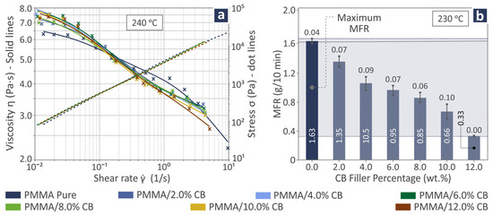Rheological characteristics for pure PMMA and PMMA/CB (with filler percentage from 2.0 wt.% to 12.0 wt.%) in (a) profiles of stress vs. shear rate and viscosity vs. shear rate and (b) MFR versus CB filler percentage bars. The dark blue bar denotes the highest reported value.