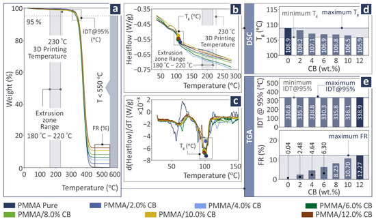Thermal characteristics reveal for PMMA/CB (with filler percentage from 0.0 wt.% to 12.0 wt.%) in (a) TGA and (b) DSC curves, and possession of (c) first derivative of the DSC signal, (d) Tg, and (e) IDT and FR recorded levels. The dark blue bar denotes the highest reported value.