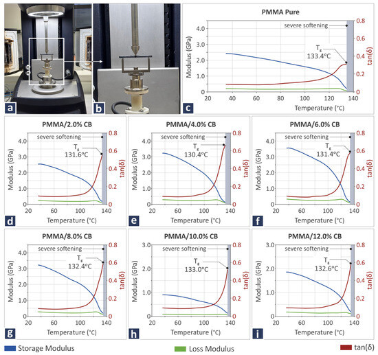 The DMA results, revealing the viscoelastic behavior of the new nanocomposites prepared herein, are shown in Figure 6, including two images captured during the conduction of DMA (Figure 6a,b), as well as curves showing the storage and loss modulus, as well as tan(δ) for pure PMMA (Figure 6c), PMMA/CB 2.0 wt.% (Figure 6d), PMMA/CB 4.0 wt.% (Figure 6e), PMMA/CB 6.0 wt.% (Figure 6f), PMMA/CB 8.0 wt.% (Figure 6g), PMMA/CB 10.0 wt.% (Figure 6h), and PMMA/CB 12.0 wt.% (Figure 6i) samples. Notably, the CB introduction to PMMA led to a Tg temperature decrease in relation to pure PMMA, regardless of the CB filler percentage. Moreover, different storage modulus responses were observed for different filler quantities, particularly for the PMMA/CB 10.0 wt.%, which is also the composite sample presenting a different loss modulus behavior in relation to the rest of the composites.