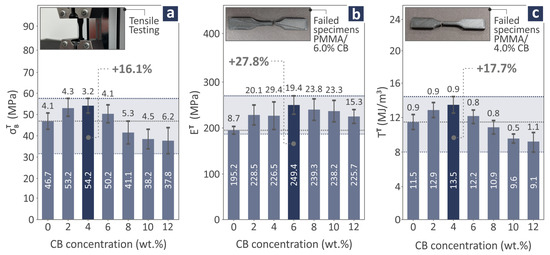 PMMA/CB 0.0–12.0 wt.% composite tensile coupon testing: (a) tensile strength levels and tensile testing image of a coupon, (b) tensile modulus of elasticity levels and a failed PMMA/CB 6.0 wt.% specimen image, and (c) tensile toughness levels and a PMMA/CB 4.0 wt.% specimen image. The dark blue bar denotes the highest reported value.
