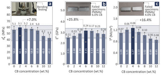 PMMA/CB 0.0–12.0 wt.% composite bending coupon testing: (a) bending strength levels and bending testing image of a coupon, (b) bending modulus of elasticity levels and a failed PMMA/CB 6.0 wt.% specimen image, and (c) bending toughness levels and a PMMA/CB 4.0 wt.% specimen image. The dark blue bar denotes the highest reported value.