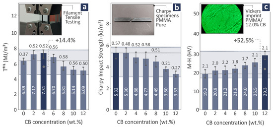With regard to PMMA/CB 0.0–12.0 wt.% nanocomposites: (a) tensile toughness filament levels and tensile testing image of filament, (b) Charpy impact strength levels and a failed pure PMMA specimen image, and (c) M-H levels and a PMMA/CB 12.0 wt.% Vickers imprint image. The dark blue bar denotes the highest reported value.