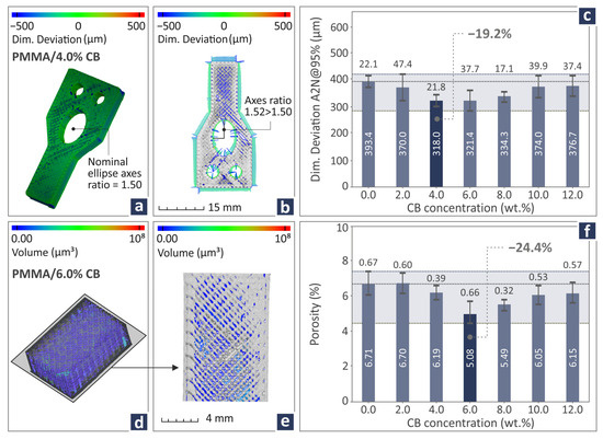 Figure 10 shows the dimensional deviation and porosity-derived data from the examination of the PMMA/CB composites. In particular, Figure 10a,b show the dimensional accuracy of a PMMA/CB 4.0 wt.% CT-scan 3D printed sample by color-coding mapping. Figure 10c shows the dimensional deviation levels of all PMMA/CB (0.0–12.0 wt.%) composite samples and indicates that PMMA/CB 4.0 wt.% has the lowest dimensional deviation levels, 19.2% lower than pure PMMA. In Figure 10d,e, color-coding mapping is again applied for the projection of the PMMA/CB 6.0 wt.%. Figure 10f displays the porosity levels of all PMMA/CB (2.0–12.0 wt.%) nanocomposites and highlights the 6.0 wt.% as the one with the lowest porosity levels, being 24.4% lower than pure PMMA. Additional dimensional deviations and void graphs are presented in Figure S4 of the Supplementary Material.