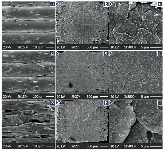 SEM images showing lateral surfaces in 150× magnification and fractured surfaces in 27× and 5000× magnification for (a–c) PMMA/CB 2.0 wt.%, (d–f) PMMA/CB 6.0 wt.%, and (g–i) PMMA/CB 10.0 wt.%, respectively.