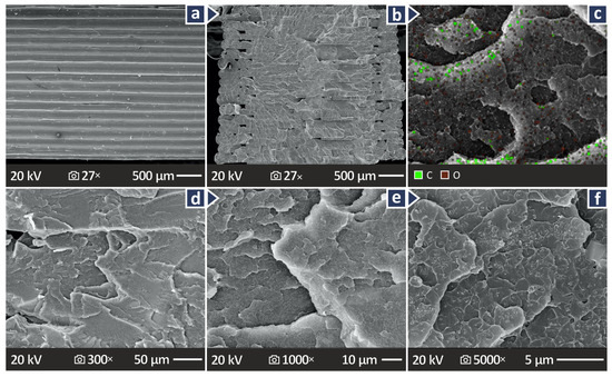 Figure 12a shows a lateral surface SEM image of the PMMA/CB 12.0 wt.% composite sample (highest loaded sample), at 27× magnification, revealing a well-layered distribution, without defects. Figure 12b,d–f show the fracture surface images at 27×, 330×, 1000×, and 5000× magnification for the PMMA/CB 12.0 wt.% composite sample, revealing again a brittle behavior. Figure 12c shows an Energy-dispersive X-ray spectroscopy (EDS) image of the PMMA/CB 12.0 wt.% showing the dispersion of C and O elements in the material. The elements are distributed throughout the observation area, as expected.