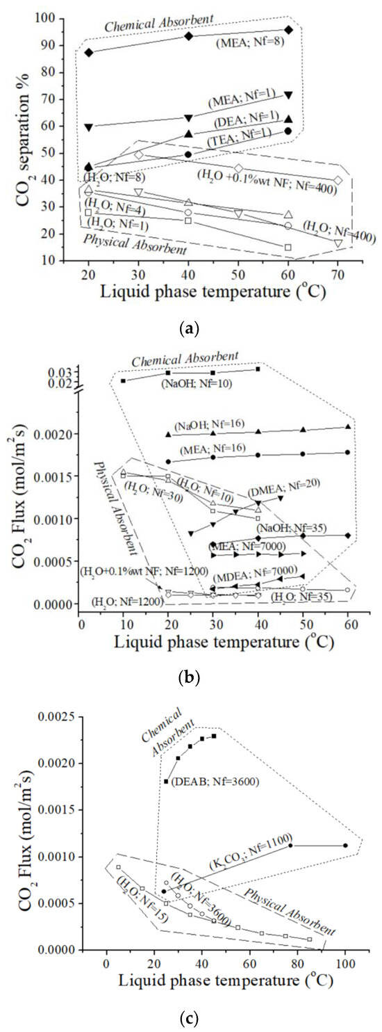 Figure 1 graphically illustrates the relationship between temperature and CO2 removal performance based on data from the selected literature [21,29,37,38,39,40,41,42,43,44,45,46]. In Figure 1a, the x-axis represents temperature in degrees Celsius, and the y-axis represents the percentage of CO2 absorbed, as reported in the selected literature [37,41]. The numbers in parentheses following the chemical names indicate the number of polymeric fibers (Nf) used in each HFM device. Figure 1a presents data for both physical absorption with H2O (using HFM devices with 1 [37], 4 [37], 8 [37], and 400 [41] polymeric fibers) and chemical absorption using a variety of amines, including MEA (Nf = 1 and Nf = 8) [37], DEA (Nf = 1) [37], and TEA (Nf = 1) [37].