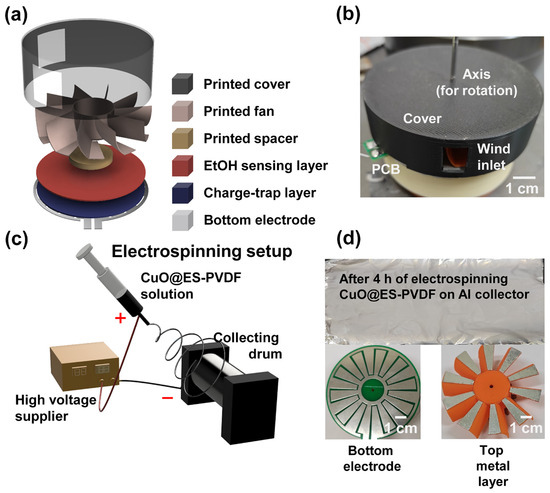 Design concepts of triboelectric ethanol sensor (TEES): (a) schematic image for showing the device structure of TEES; (b) digital camera image of TEES; (c) schematic diagram of electrospinning process for fabricating CuO@ES-PVDF layer; (d) digital camera images of CuO@ES-PVDF layer, bottom electrode, and top metal layer.
