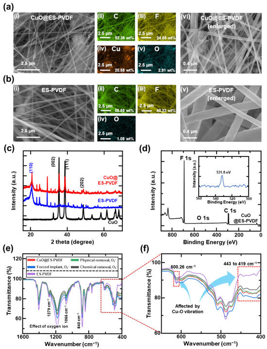 Surface characterization of CuO@ES-PVDF: (a) SEM images of CuO@ES-PVDF: (i) SEM image of CuO@ES-PVDF at large scale, (ii–v) EDS mapping result of CuO@ES-PVDF, and (vi) enlarged SEM image of CuO@ES-PVDF; (b) SEM images of ES-PVDF: (i) SEM image of ES-PVDF at large scale, (ii–iv) EDS mapping results of ES-PVDF, and (v) enlarged SEM image of ES-PVDF; (c) XRD patterns of CuO@ES-PVDF, ES-PVDF, and CuO; (d) XPS spectra of CuO@ES-PVDF; (e) FT-IR spectra for CuO@ES-PVDF, physically removed oxygen, chemically removed, forced implant oxygen ion of CuO@ES-PVDF, and ES-PVDF. (f) Enlarged spectra of FT-IR data from 400 cm−1 to 640 cm−1.