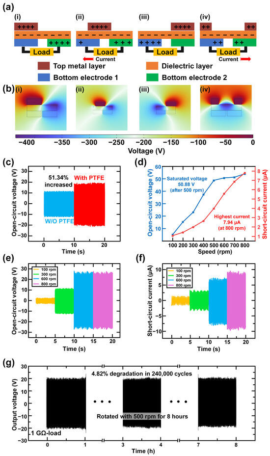 Electrical output generating mechanism and characterization of TEES. (a) Working mechanism of TEES: (i) The top metal layer (TM layer) aligns with bottom electrode 1 (BE1); (ii) the TM layer moves between BE1 and bottom electrode 2 (BE2); (iii) the TM layer aligns with BE2; (iv) the TM layer moves from BE2 to BE1. (b) Finite element method simulation of TEES: (i) simulation result of the TM layer aligned with BE1; (ii) simulation result of the TM layer moving from BE1 to BE2; (iii) simulation result of the TM layer aligned with BE2; (iv) simulation result of the TM layer moving from BE2 to BE1. (c) Open-circuit voltage difference with/without PTFE layer. (d) Electrical output trends with different input rotational speed. Output waveforms of (e) open-circuit voltage and (f) short-circuit current by varying rotational speed. (g) Durability result of TEES rotating with 500 rpm for 8 h.