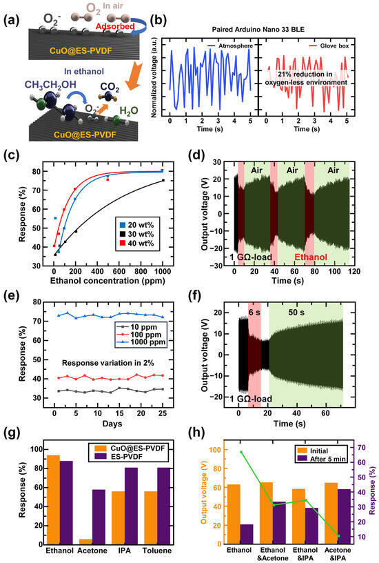 The schematic diagram of the sensing mechanism of CuO@ES-PVDF is demonstrated in Figure 4a. Oxygen molecules were adsorbed onto the surface due to the oxygen vacancies in CuO, enabling the formation of oxygen ions. When CuO@ES-PVDF was exposed to an ethanol-containing environment, ethanol molecules reacted with the adsorbed oxygen ions, and electrons returned to the conduction band of CuO, leading to a decrease in surface charge density. The existence of oxygen ions was confirmed by FT-IR analysis, and Figure 4b illustrated the influence of CuO on the electrical output of TEES. Previous characterization experiments proved that oxygen molecules were adsorbed onto the surface of CuO@ES-PVDF and formed oxygen ions. This experiment aimed to determine the effect of oxygen ions on the electrical output. A direct current (DC) motor was used to provide a stable rotation speed for TEES, operating in both atmospheric and oxygen-depleted environments. TEES was connected to an Arduino Nano 33 BLE (Arduino Nano) and was rotated by the DC motor to generate electrical output inside a glove box with an argon-only environment. Another Arduino Nano was paired to read the output voltage from the Arduino Nano inside the glove box. As shown in Figure 4b, the output voltage exhibited a 21% reduction in the oxygen-depleted environment, which was influenced by the presence of adsorbed oxygen ions. Thus, this experiment demonstrated that oxygen ions were adsorbed by CuO nanoparticles through the ES-PVDF fiber, enabling the detection of ethanol vapor.